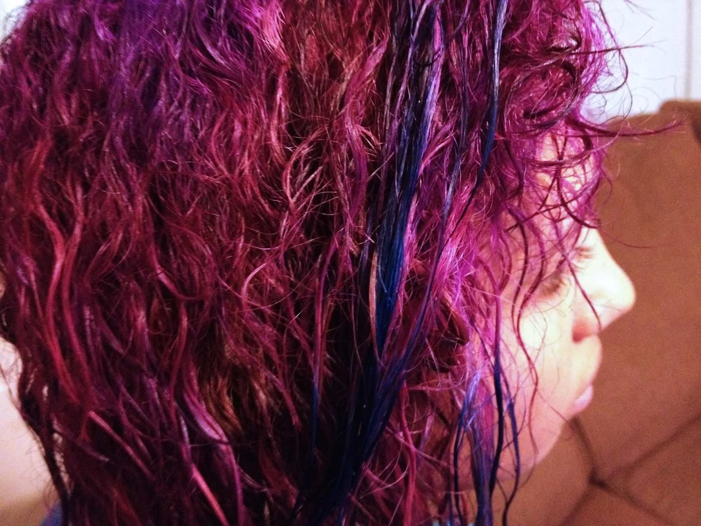 My little one colored her hair again. Purple with bits of dark blue. This is her just out of the shower. I think this might be one of my favorite versions.