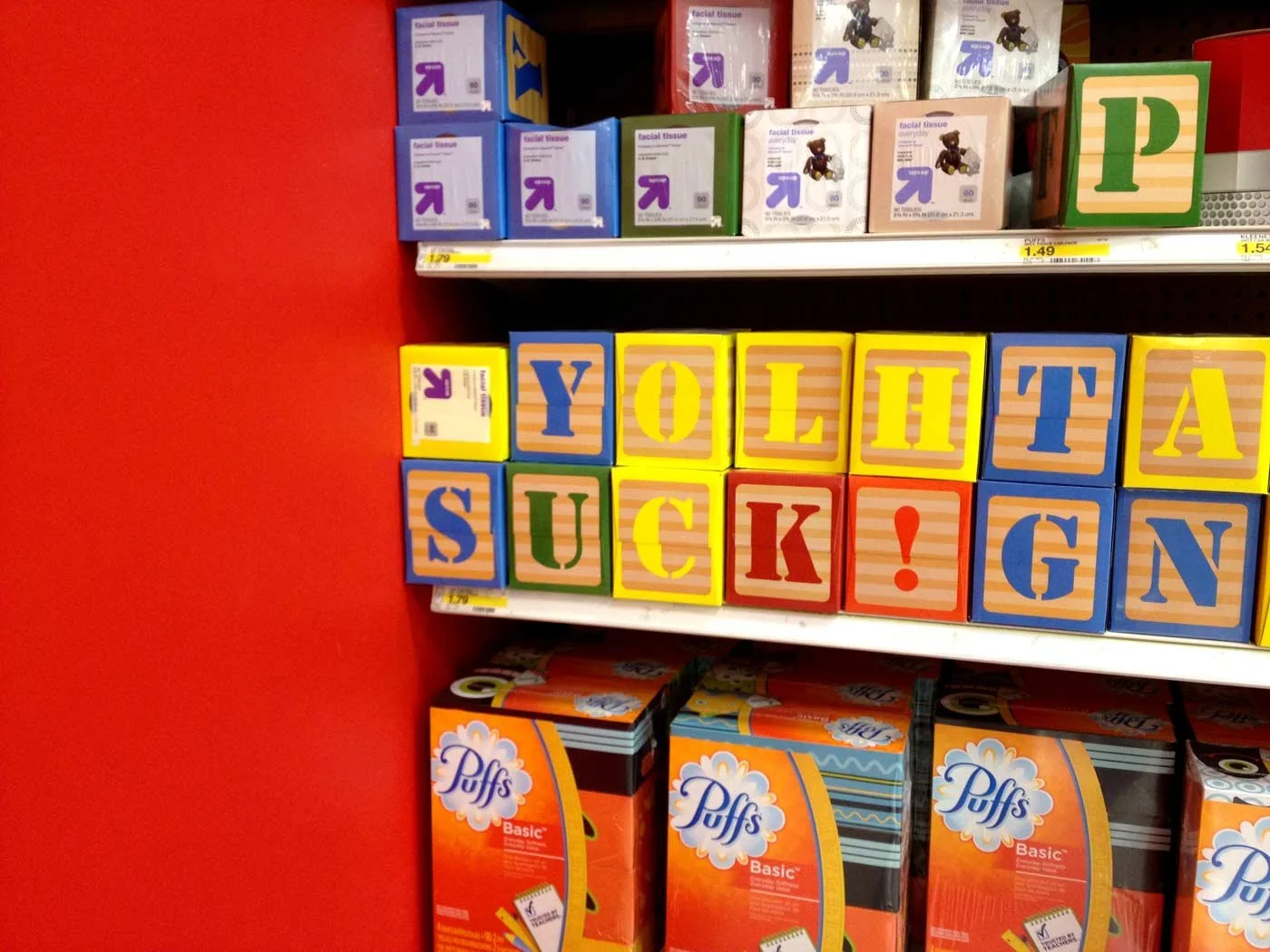 Let me start by saying I DID NOT DO THIS! I was in Target looking for something and this is in the farthest corner of the store. I DID THINK IT WAS FUNNY, though.