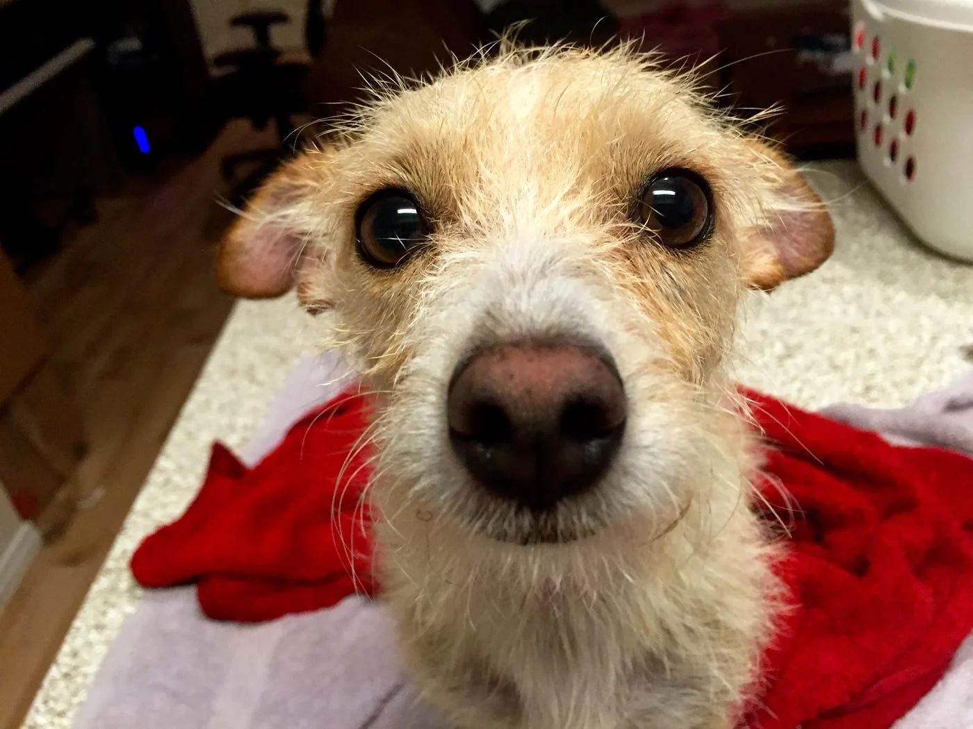 These new little ones don't know how to sleep in on the weekend. This is Biscuit, she's has no issues climbing all over me like she's known me forever. We need to work on her manners. I've never had any dogs that seem to actually watch TV. I was watching The Dog Whisperer the other day and they get visibly upset when they see dogs acting up on TV.
