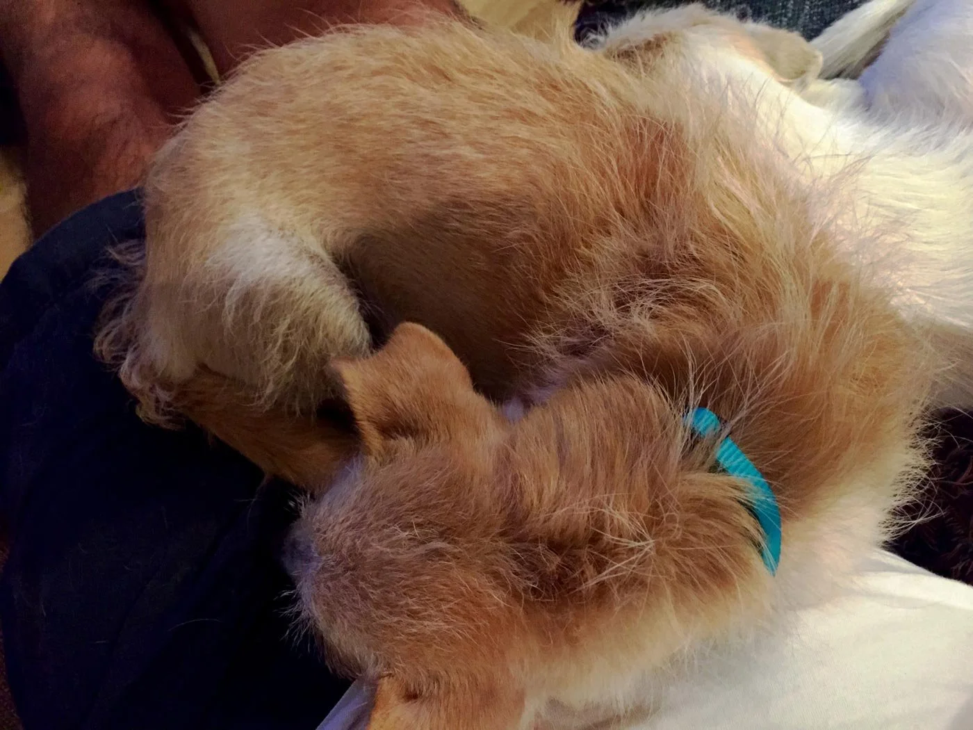 Yes, another picture of the dogs. I have never let my dogs sleep with me, but they've never been this small either. My thinking was that they wouldn't poop or pee where they sleep so this way they wouldn't have an accident during the night. They started out sleeping at the foot of the bed. I guessing they're more comfortable with me now.