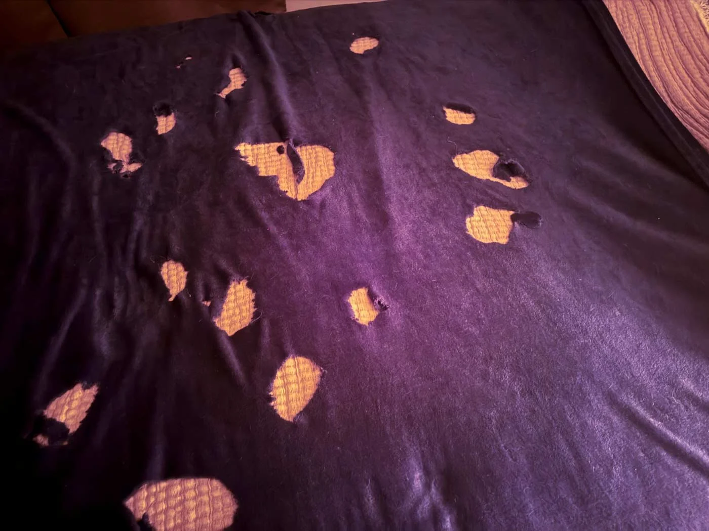 August 13, 2025 Wednesday - I did a couple of loads of laundry today. I washed my sheets and blankets too. I finished this last load just in time for bed. As I was making my bed I decided this would be my photo of the day. This is one of the ways Zak’s anxiety shows itself. Fortunately he doesn’t chew the blanket underneath. I’m not even sure how he does that.