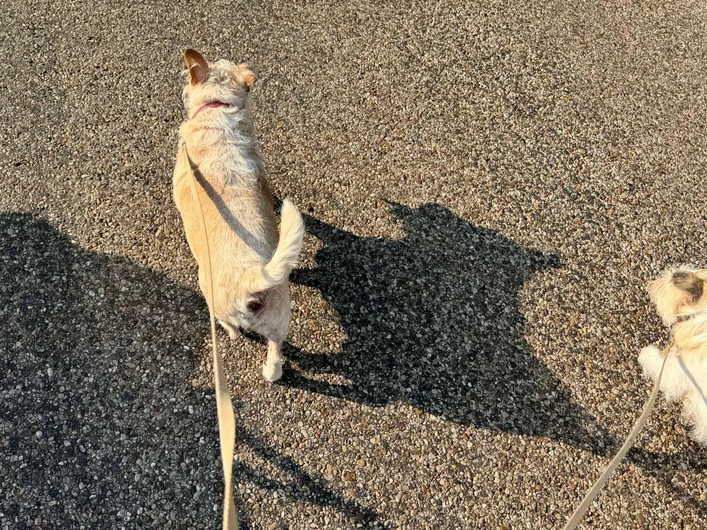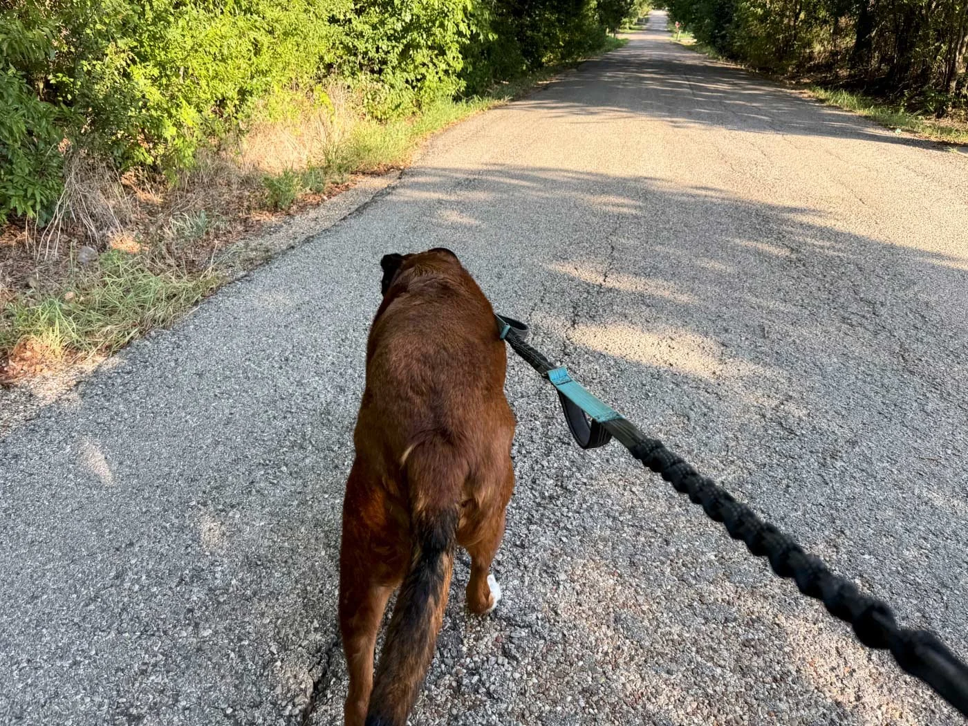 August 24, 2025 Sunday - I was able to get my last video wrapped up this afternoon. I got out to take all the pups for a long walk. I thought Pancake’s shadow looked funny. Not necessarily in this photo, but it made me pull out my phone and get this photo of her walking down the road.