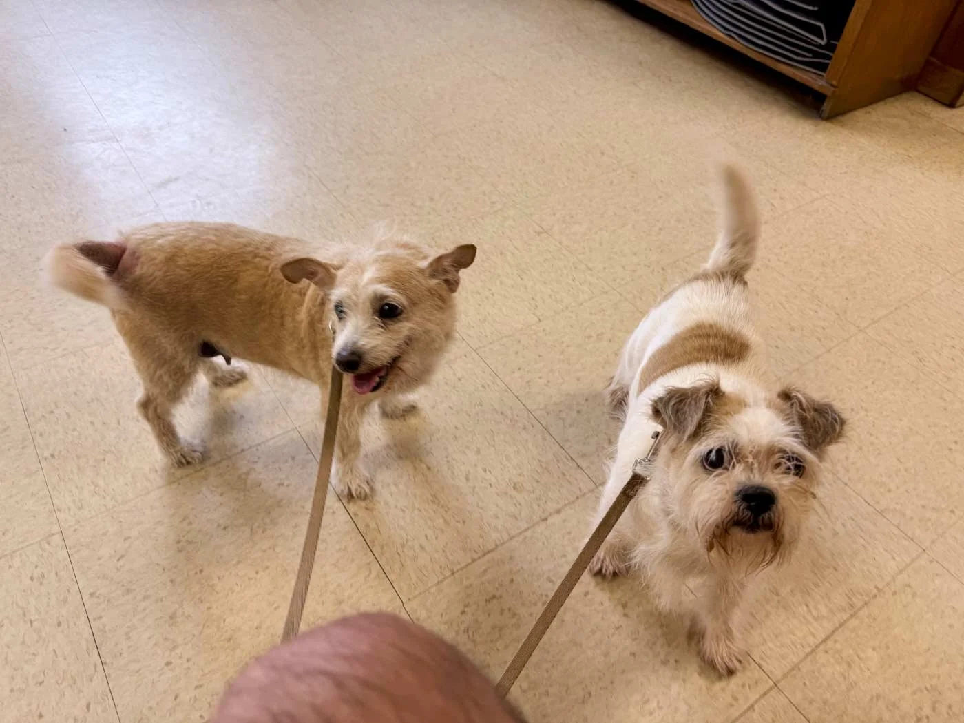 May 2, 2025 Friday - Today was Biscuit and Pancake’s turn to go to the vet for their vaccinations. They were really well-behaved. Surprisingly. On the way in, I saw the prettiest Corgi. It had the normal brown and white fur pattern, but the dark brown area was brindle. I’ve never seen a brindle Corgi. There was also the most handsome pit mix in there. He growled a lot, and no one sat near him.