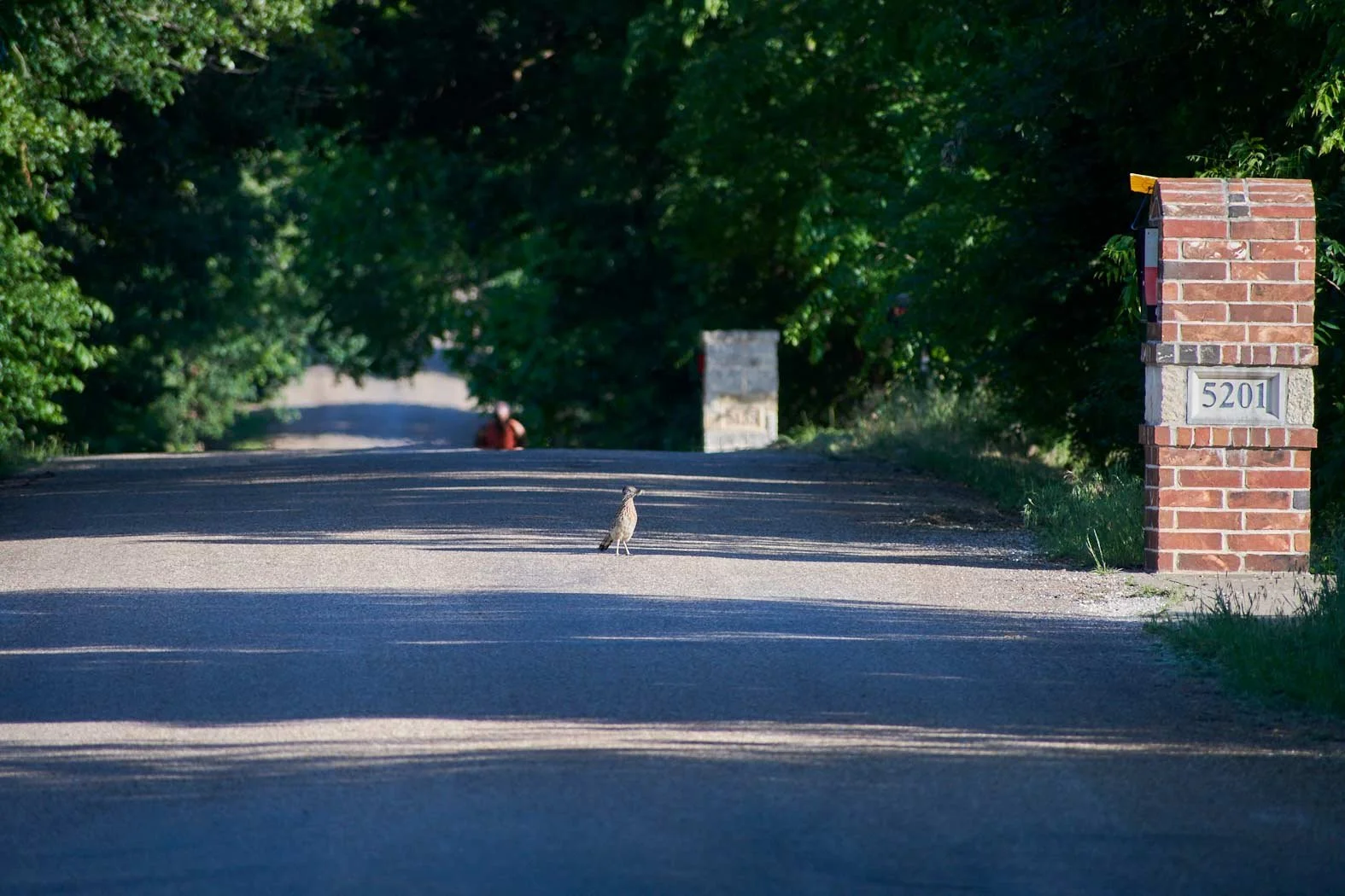 May 4, 2025 Sunday - This morning as we were walking down the road, this roadrunner was running back and forth across the road ahead of us. It disappeared into the brush. The dog at the end of the road came out to say hi. Zak did so much better than usual. He’s getting better. On the way back home, another bird was running across the road. I only got the top of his head over the top of a rise in the road.