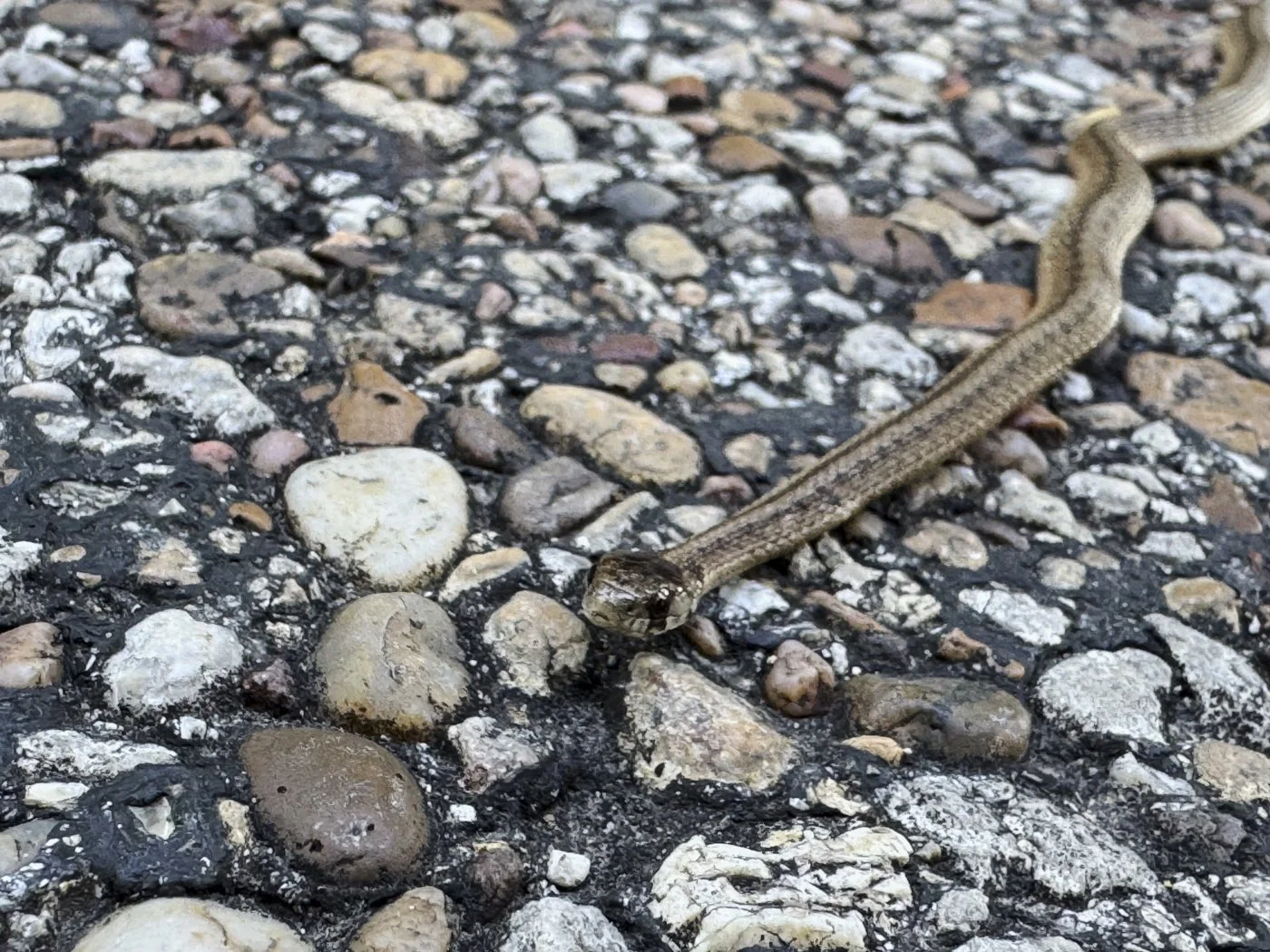 May 9, 2025 Friday - We came across this little guy on our morning walk. At first, I thought maybe it was dead because it wasn’t moving at all. The dogs didn’t even notice him in the middle of the road. When I realized he was alive, I thought to move him to the side of the road but thought I’d leave him be. It was just a couple of minutes later on our way back when we passed, and he was nowhere to be found.