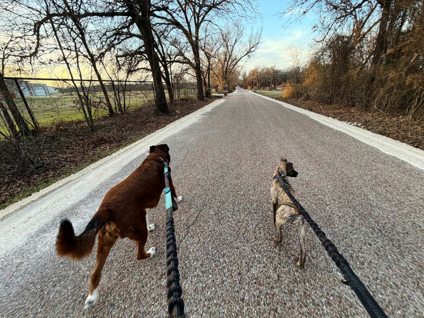 February 22, 2025 Sunday - Today I spent most of the day working again. I’m still taking Butter out every two hours, and we still do our morning and evening walks. I got this photo of me, Zak, and Butter this evening. Biscuit and Pancake were too short to cast a shadow long enough to get in the photo.