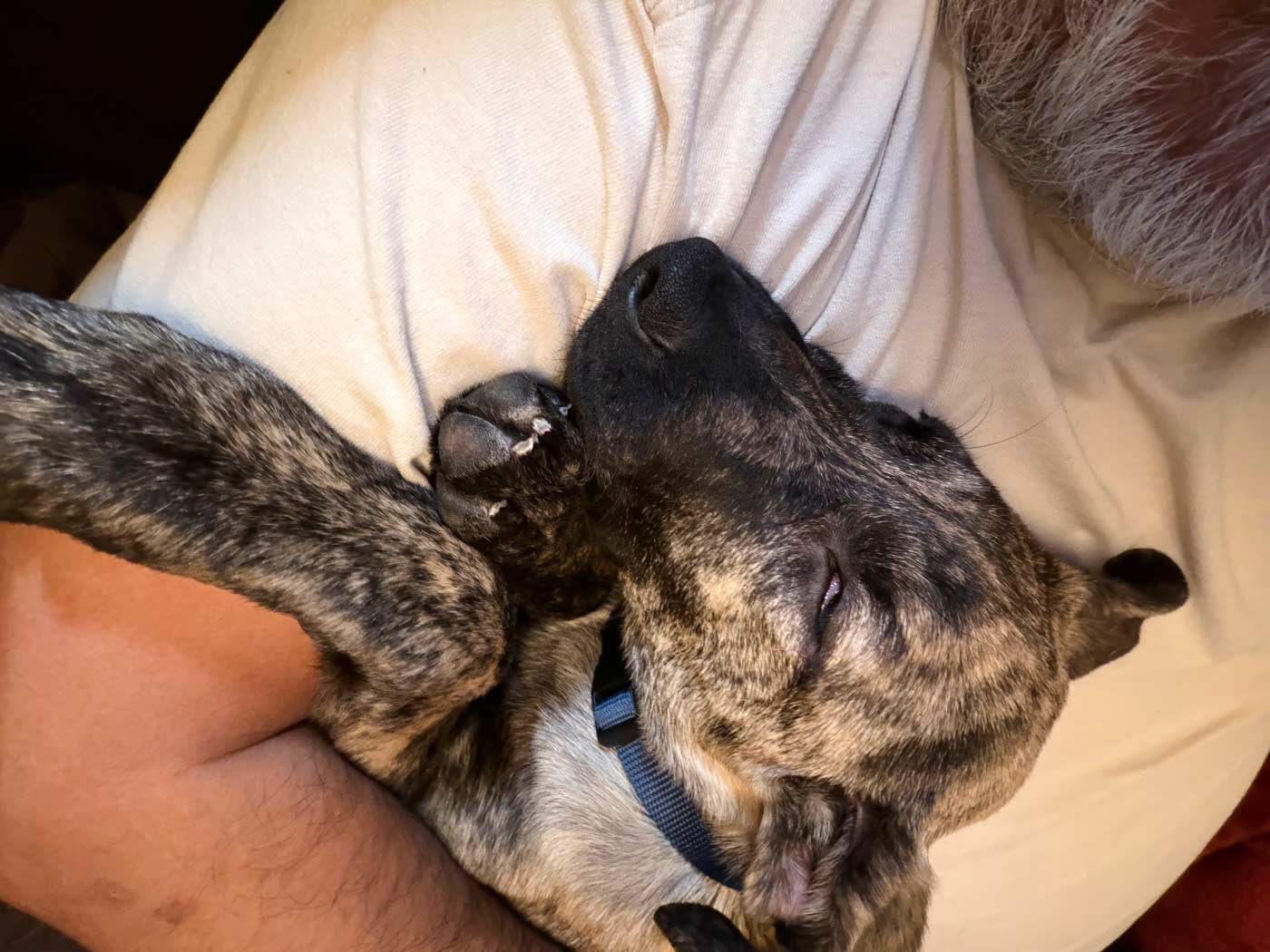 February 12, 2025 Thursday - When she’s not trying to play with Zak or harassing the girls or peeing she’s taken to sleeping at my feet under my desk. I’ve also realized how much I take for granted how well behaved Zak and the girls are. She has learned “sit” pretty quickly, but everything else is a work in progress. She walks pretty well on a leash.