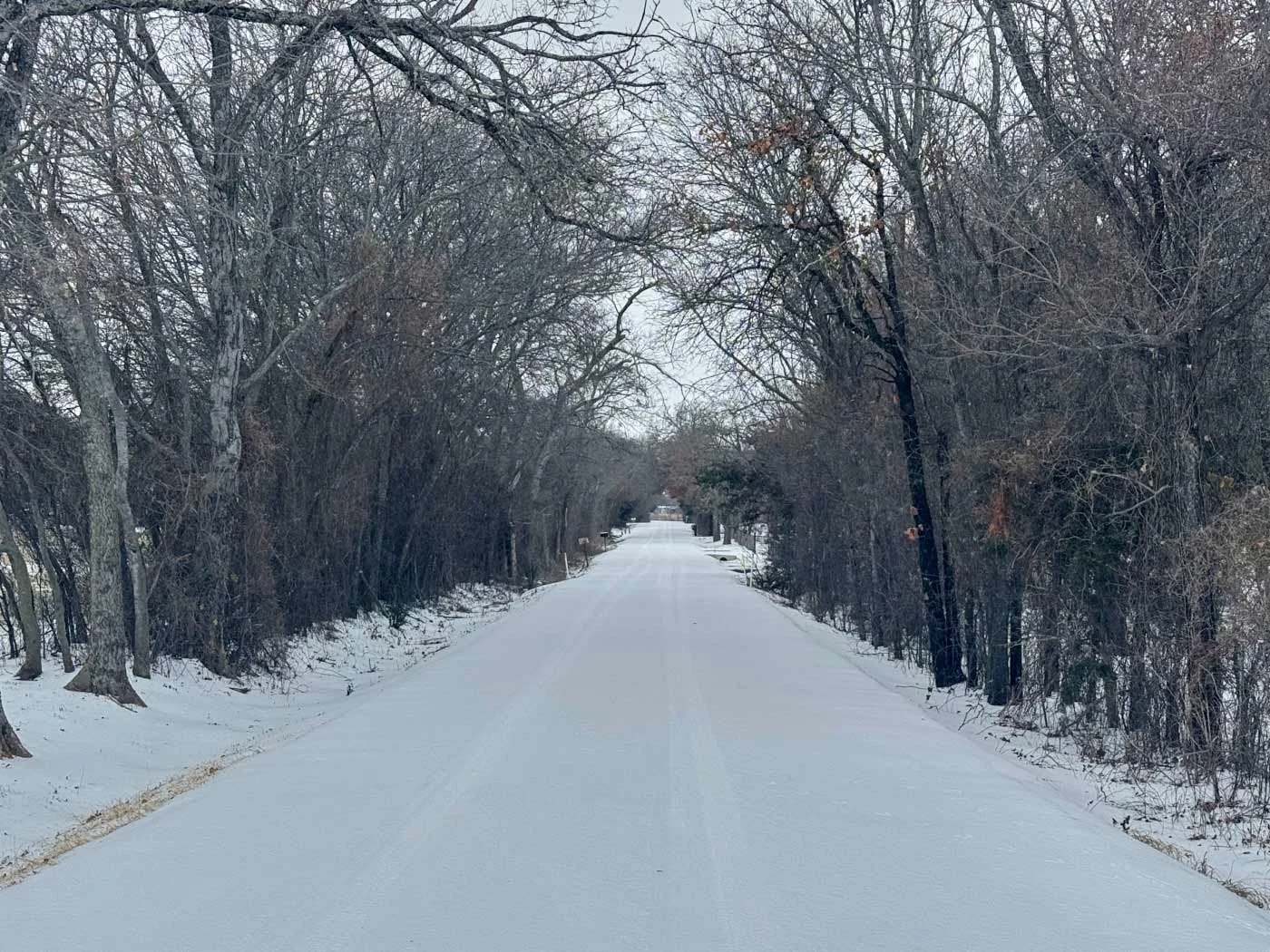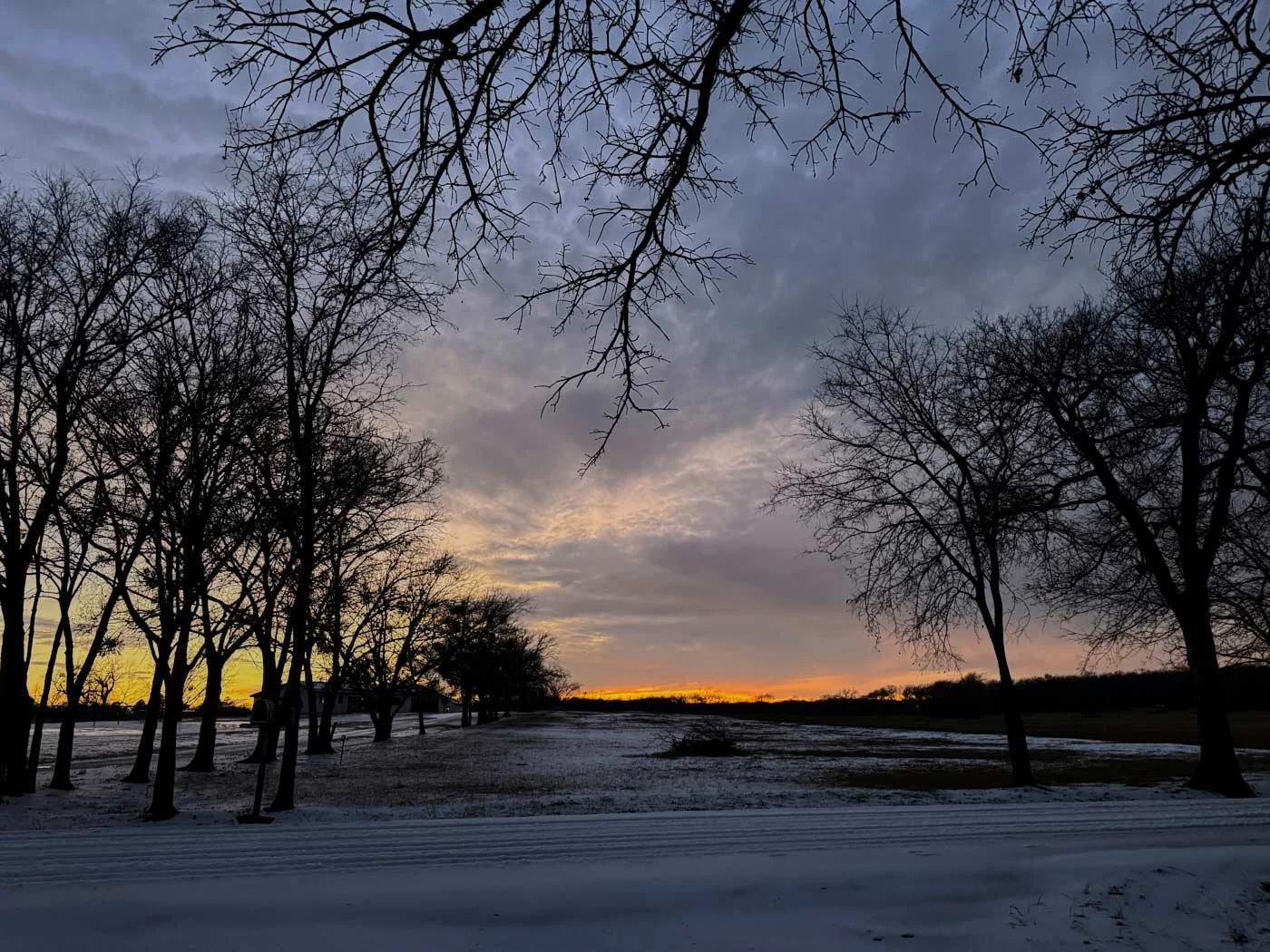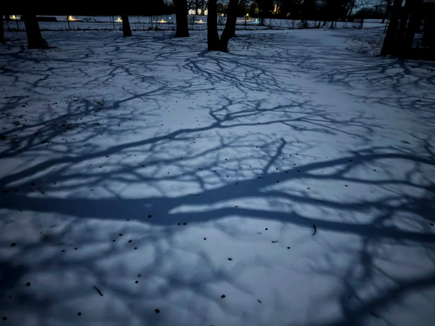 January 26, 2025 Monday - This cold weather has all of us not really wanting to go for long walks in the evening. After work, I took the pups out, and with the bright moon out tonight, the ground looked a bit like a big slab of marble. I took the pups back in and then came out to get this photo. I love all the trees in the front yard.