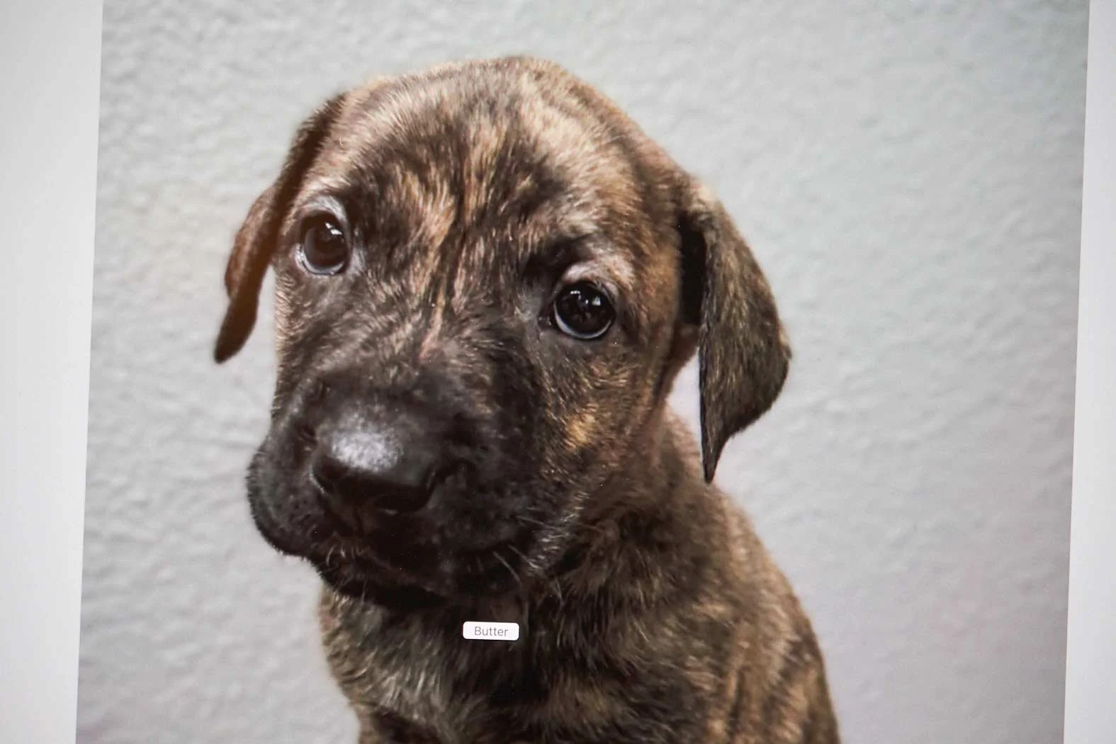 March 16, 2026 Monday - Getting a photo with my camera instead of my phone is a bit of a challenge. Butter is very curious about everything. The foggy corner in this photo is from the smudge from her nose on the lens. I got online and looked at the shelter’s Facebook page and found her original adoption photo from when she was only 2 month old. She was so cute.